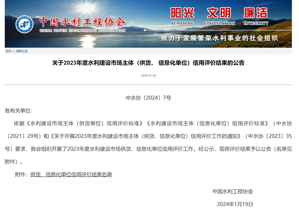 2024年1月19日,中國水利工程協(xié)會發(fā)布了《關(guān)于2023年度水利建設(shè)市場主體(供貨、信息化單位)信用評價結(jié)果的公告》。在此次評價中,金控數(shù)據(jù)以其卓越的綜合實(shí)力和良好的信用記錄,榮獲“全國水利建設(shè)市場主體AAA級信用評價”
