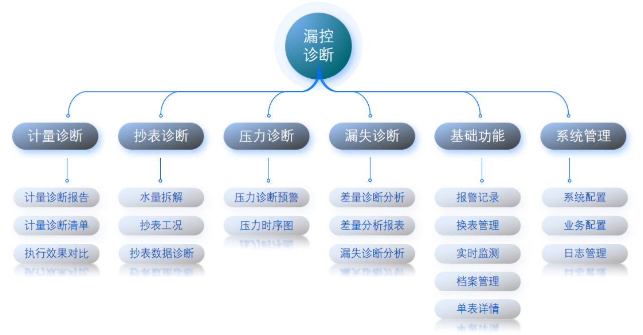 產品核心功能包括:計量診斷、抄表診斷、壓力診斷、漏失診斷等。可以全方位幫助客戶從表觀漏損、物理漏損、管理漏損三位一體全面診斷漏損的問題。