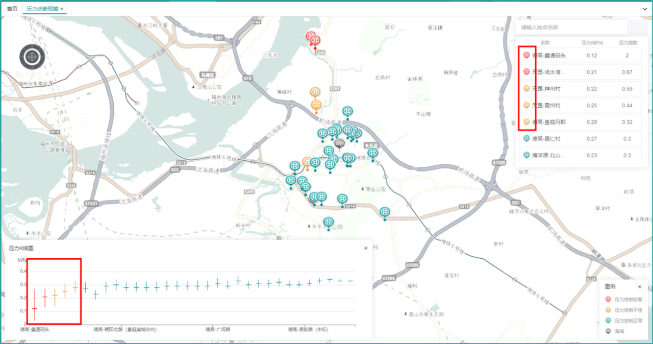 系統對管網壓力健康度進行細致評估,并利用壓力與流量數據的綜合分析,以圖形化方式高亮異常情況。揭示管網數據背后的潛在問題,包括水盜取、管網破損、爆管等,為供水企業提供清晰的診斷視圖,促進快速識別并處理管網隱患。